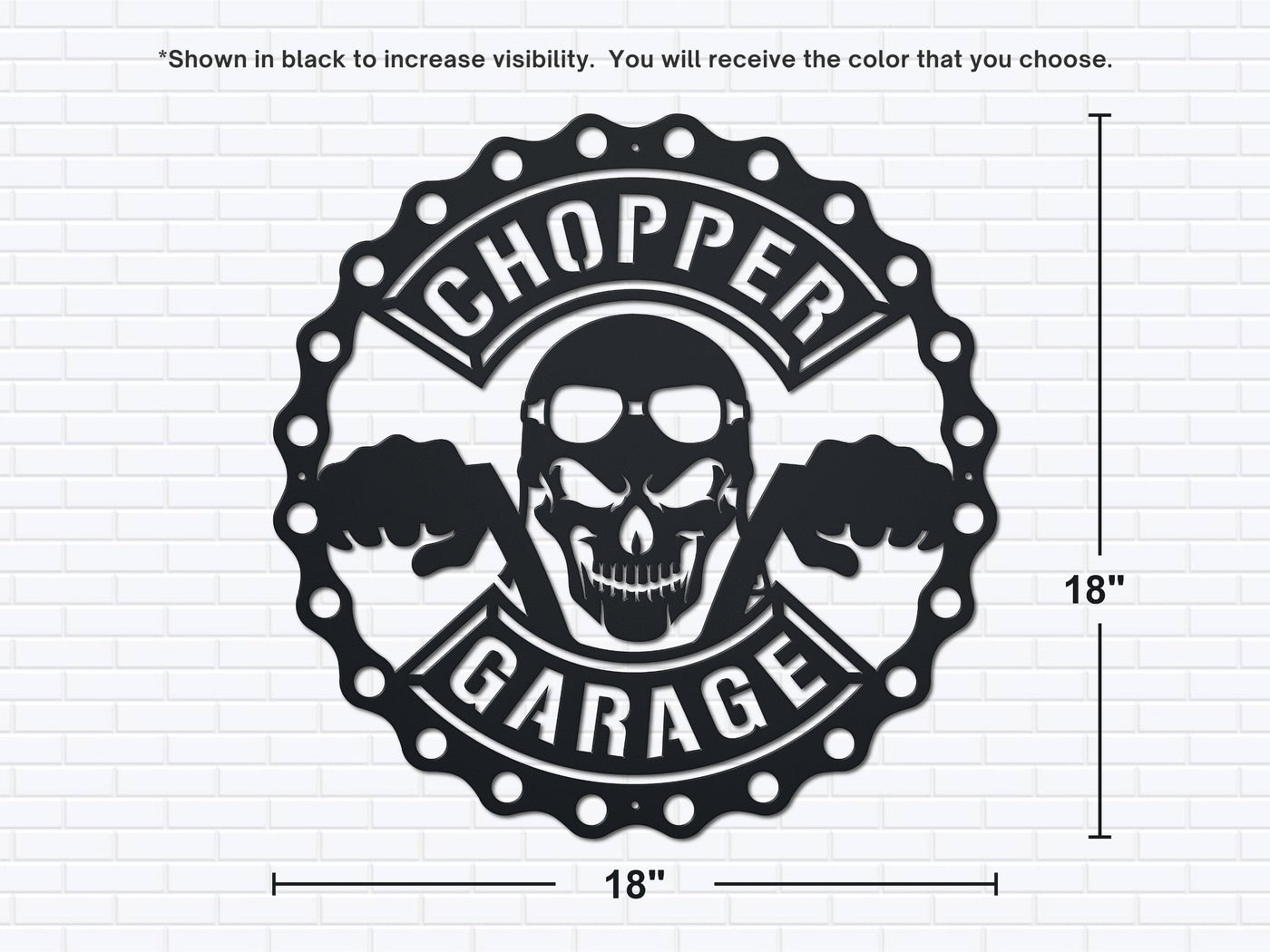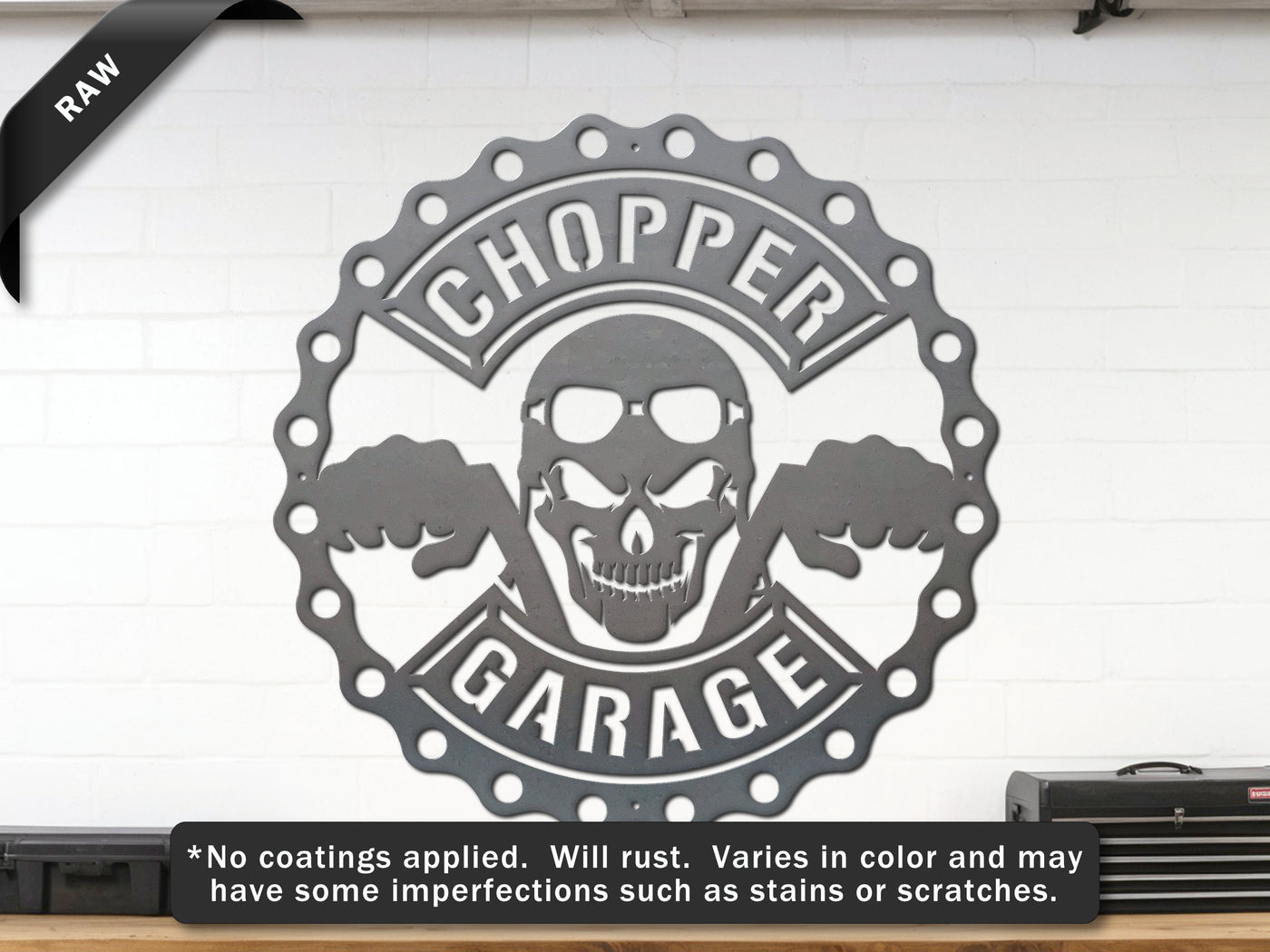 Bring raw horsepower and bold personality to your space with this Chopper Garage metal wall sign. Crafted from heavy-duty 14-gauge steel and available in your choice of durable powder coat finishes or raw steel, this piece is built for bikers who live life wide open.