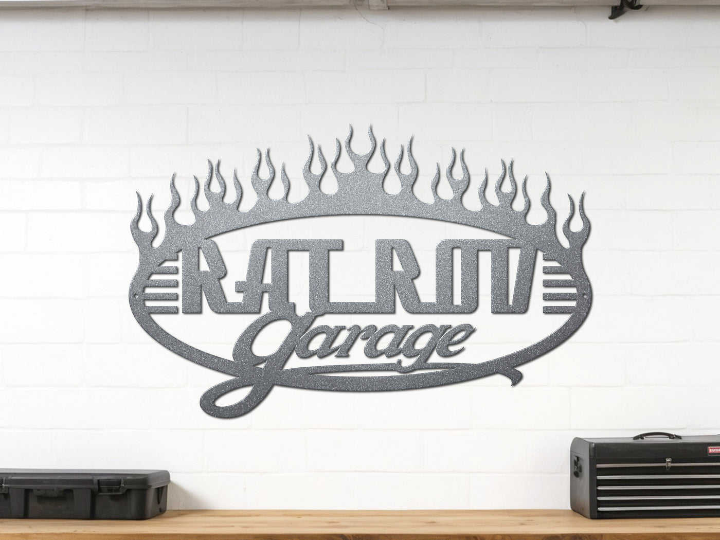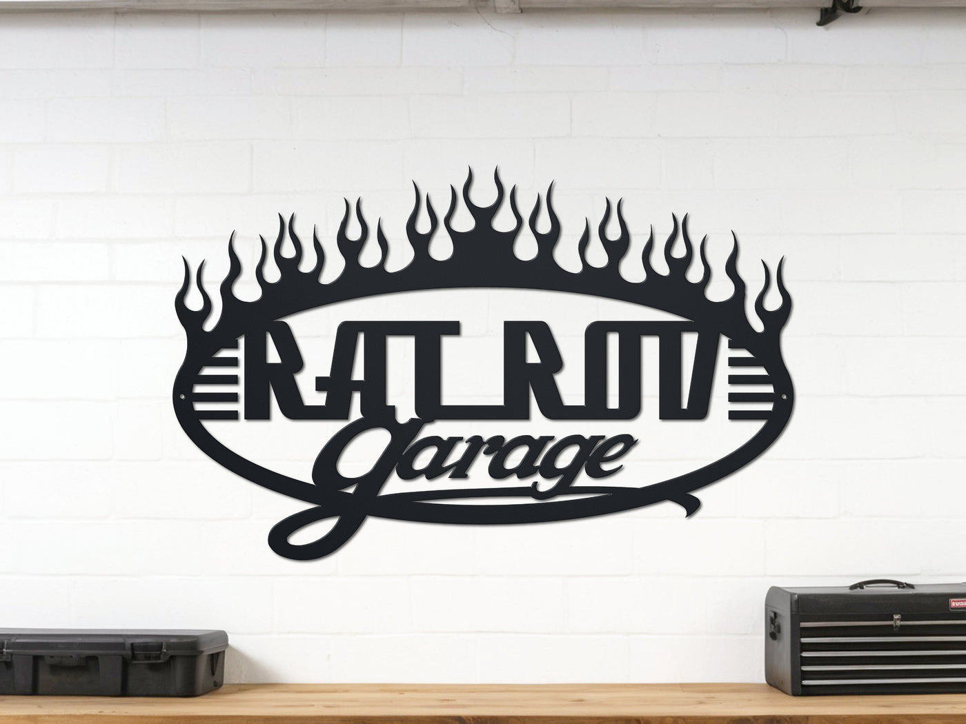 Rat Rod Garage Metal Sign – Flame Wall Art for Gearheads