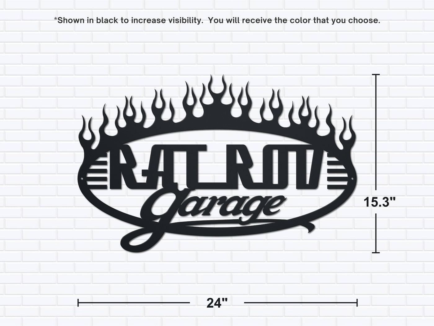 Rat Rod Garage Metal Sign with Flames – 14 Gauge Steel Wall Art Made in USA