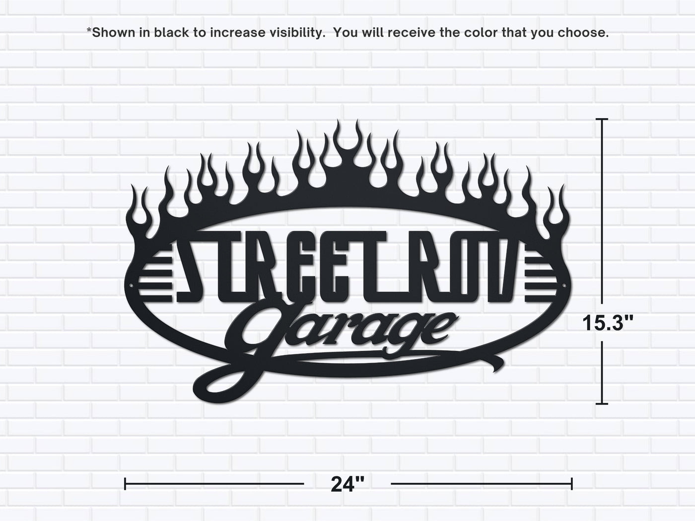 Bring horsepower and attitude into your garage, shop, or man cave with this bold flame design Street Rod Garage metal wall sign. Crafted in the USA from 14-gauge steel and finished with a durable powder coat (optional, with multiple colors available), this heavy-duty sign is built to last and built to impress.